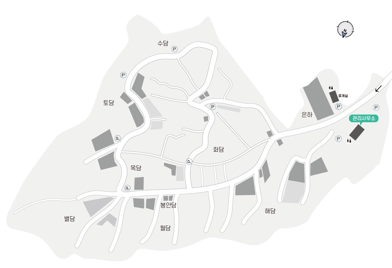진입로의 대형 주차시설과 휴게시설 그리고, 각 지구별로 주차장이 마련되어있습니다.